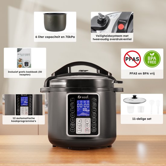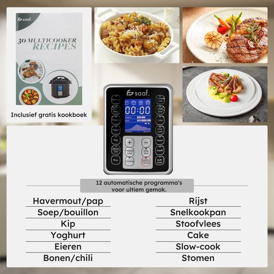 Der Saaf Slowcooker integriert 12 Kochprogramme in einem vielseitigen Gerät. Ob Sie dämpfen, backen, Reis kochen, braten oder langsam kochen möchten, diese multifunktionale Lösung macht es möglich. Mit seinem digitalen Display und dem mitgelieferten Zubehör ist das Kochen so einfach wie nie zuvor.