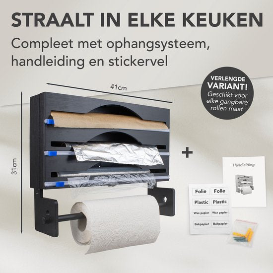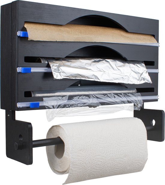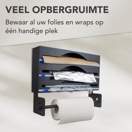 Nimma Rollenhalter - Küchenrollenhalter und Folienhalter in 1 - Inkl. Aufhängesystem und Folienschneider - Geeignet für 3 Folienrollen - Bambus - Schwarz
