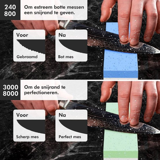 - Inhalt:1x Messerschärfer 8000 - 3000, 1x Wetstone 800 - 240, 2x rutschfester Silikonhalter, 1x Verpackung, 1x Gebrauchsanleitung