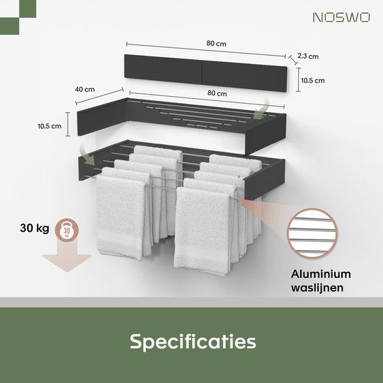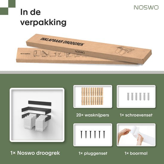 Noswo Zusammenklappbarer Wäscheständer - Wandtrockner - Inklusive 20 Wäscheklammern - Hängender Wäscheständer - Zusammenklappbar - Wand - Aufhängbar - 4m Trocknungslänge - Schwarz