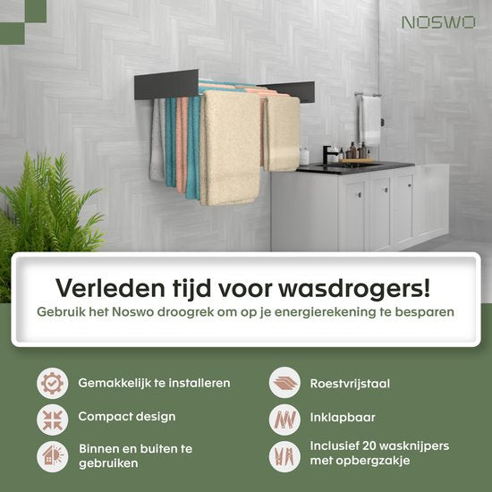 Haben Sie zu wenig Platz für nasse Wäsche oder Badezimmerwäsche? Dieser Trockenständer von Noswo bietet eine Lösung, denn er lässt sich zusammenklappen und bietet Ihnen eine einfache Lösung für dieses Problem. Er ist ideal für jeden Ort in Ihrer Wohnung, an dem Sie Ihre Wäsche oder Badtextilien trocknen möchten. Nach dem Aufhängen der Wäsche haben Sie wieder viel Platz, und mit den zusätzlich enthaltenen 20 Wäscheklammern können Sie sicher sein, dass alles sicher hängt.
