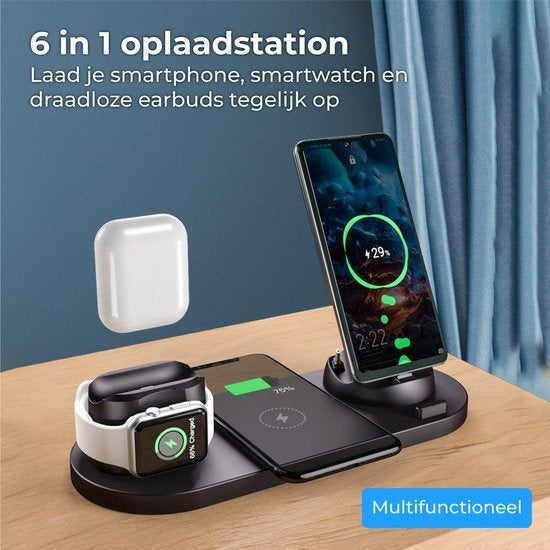 Jeder kennt das Gefühl, dass man lange unterwegs ist und dann ist das Handy, der kabellose Kopfhörer oder die Smartwatch leer und wir haben eine Lösung dafür! Das kabellose 6-in-1-Qi-Ladegerät von Nuvance enthält alle Anschlüsse, die du brauchst! Damit kannst du einfach und schnell alle deine Geräte gleichzeitig aufladen! Geeignet für alle Geräte, die kabelloses Qi-Laden unterstützen.
