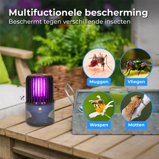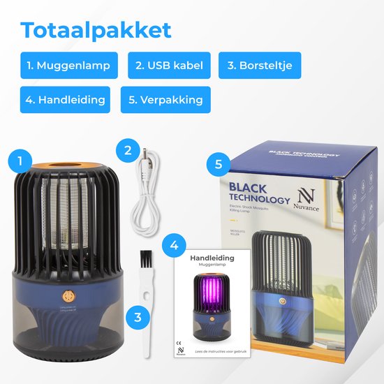 Wollen Sie eine praktische Möglichkeit, um Fliegen, Mücken und andere Insekten in Ihrem Haus und Garten zu reduzieren? Die Nuvance Mückenlampe ist für den täglichen Gebrauch konzipiert und passt dank ihres kompakten, kabellosen Designs in jeden Raum. Denken Sie an Ihr Schlafzimmer, Wohnzimmer oder Arbeitszimmer - aber auch draußen unter dem Vordach oder beim Camping. Vorteile der Nuvance Mückenlampe: Kabellos und wiederaufladbar: bequem an Orten ohne Steckdose; UV-Lampentechnologie: mit violettem Licht für den Einsatz im Dunkeln; Kompakte Mückenfalle mit Auffangbehälter: leicht zu entleeren; Geräuschloser Betrieb: angenehm beim Schlafen oder Arbeiten; Für den Innen- und Außenbereich geeignet: ideal für jeden Ort. Kompakte elektrische Fliegenlampe für zu Hause Diese elektrische Fliegenlampe ist leicht und tragbar. Sie können sie zu Hause genauso gut verwenden wie im Freien oder unterwegs. Dank des USB-Anschlusses müssen Sie keine Batterien wechseln - einfach aufladen und loslegen. UV-Insektenlampe mit geräuschlosem Betrieb Die eingebaute UV-Lampe strahlt violettes Licht aus und ist angenehm für den Einsatz am Abend oder in der Nacht. Der leise Ventilator lenkt die Insekten in die Auffangschale am Boden, ohne lästigen Lärm oder helles Licht. Indoor-Mückenlampe ohne Nachfüllpackungen Diese Anti-Mückenlampe benötigt keine Sprays, Nachfüllpackungen oder Flüssigkeiten. Sie wird einfach aufgeladen, eingeschaltet und von Zeit zu Zeit geleert - so ist sie einfach zu bedienen. Der Auffangbehälter wird mit der mitgelieferten Bürste gereinigt. Handliche Mückenfalle für den täglichen Gebrauch Die Mückenfalle eignet sich für den Einsatz an verschiedenen Orten, sowohl in Innenräumen als auch im Freien. Dank ihrer kompakten Größe und des kabellosen Betriebs können Sie sie einfach auf dem Nachttisch, dem Gartentisch oder im Zelt aufstellen - überall dort, wo Sie sich weniger Ärger mit fliegenden Insekten wünschen. Inhalt Ihrer Bestellung: 1x Nuvance Moskito-Lampe; 1x USB-C-Kabel; 1x Pinsel; 1x Anleitung.