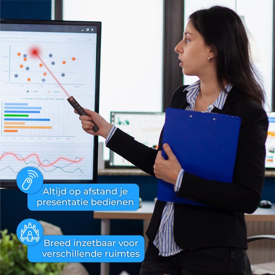 Die Bedienung Ihres Computers oder Laptops. Denken Sie nur an das Navigieren durch Folien, das Anklicken von Links und Videos und das Einstellen des Tonpegels. Außerdem verfügt er über einen hellen Laser, mit dem Sie aus jedem Winkel des Raums auf alles auf dem Bildschirm zeigen können.Kabelloses Design