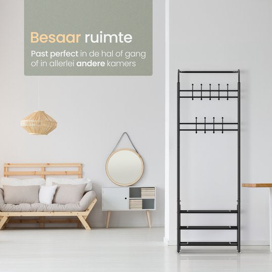 MATERIAL: Dieser Garderobenständer ist aus Metall mit einer schwarzen, matten Pulverbeschichtung hergestellt. Die Garderobe verfügt über achtzehn Haken für Mäntel, Schals usw. und drei Ablagen für Schuhe und Hüte. Diese Garderobe bietet Platz für mindestens 6 Paar Schuhe und 18 Mäntel, einschließlich Kindermäntel. So kommen Sie immer in einem aufgeräumten Haus nach Hause!