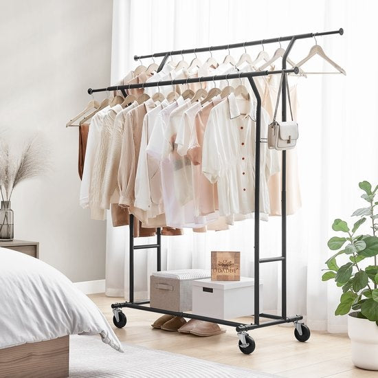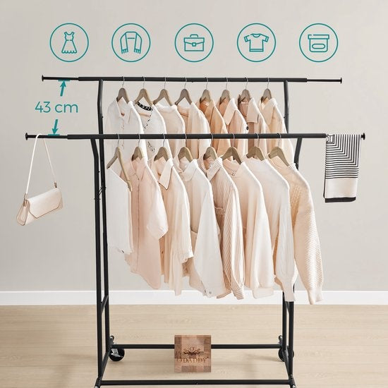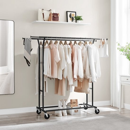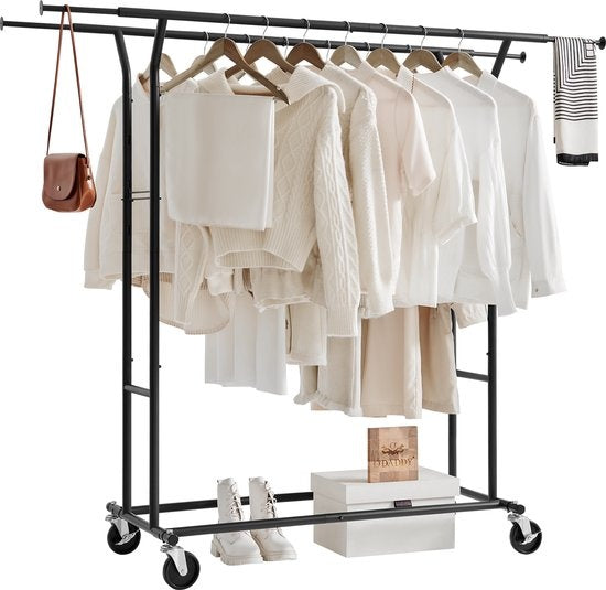 VERSTELLBAR: Der Kleiderständer ist auf beiden Seiten ausziehbar (129-169 cm), also sehr viel Platz und es gibt einen Stopper, so dass die Bügel nicht vom Ständer rutschen können. Die Höhe kann von 148 bis 172 cm eingestellt werden. Die Streben an den Seiten sind ebenfalls höhenverstellbar STABIL UND BIS 110 KG TRAGEFÄHIG: Der Winkel der oberen Winkelstangen wurde neu gestaltet, eine gute Stabilität ist gewährleistet, der Kleiderständer kann kaum umkippen. Die seitliche Verstrebung erfolgt durch spezielle Haken an der Stange, auch unter Belastung ist sie sehr stabil. Am Rohrende der oberen Schrägstangen ist der Durchmesser in 3 Dimensionen, durch diese spezielle Bearbeitung des Rohrendes sind die Stangen besonders fest verbunden 4 INDUSTRIERÄDER: Im Gegensatz zu den Nylonrollen sind diese Schwerlasträder größer und auch leichter zu manövrieren, auch unter Volllast (110 kg) können Sie den Kleiderständer noch gut manövrieren. 2 Räder mit Bremsen, die bei Bedarf festgestellt werden können. Auch für den Textileinzelhandel geeignet, entspricht den gewerblichen Anforderungen. EINFACHE MONTAGE: Dank der übersichtlichen Anzahl der Einzelteile und der leicht verständlichen Anleitung ist dieser Kleiderständer einfach zu montieren. In nur wenigen Schritten und Klicks haben Sie einen stabilen verchromten Metall-Kleiderständer SPEZIFIKATIONEN: Abmessungen: 129 x (148-172) x 55 cm (B x H x T) Höhe der Rollen: 12 cm Material: verchromte Eisenrohre Farbe: schwarz Verpackungsmaße: 90 x 59 x 11,9 cm (B x H x T) Nettogewicht: 8,9 kg INHALT PAKET: 1 x Kleiderständer in Teilen 1 x Anleitung (NL, EN, FR, ES, IT, DE) Wir bieten Ihnen einen professionellen Kundenservice vor und nach dem Kauf. Sie haben immer eine Bedenkzeit von 30 Tagen.