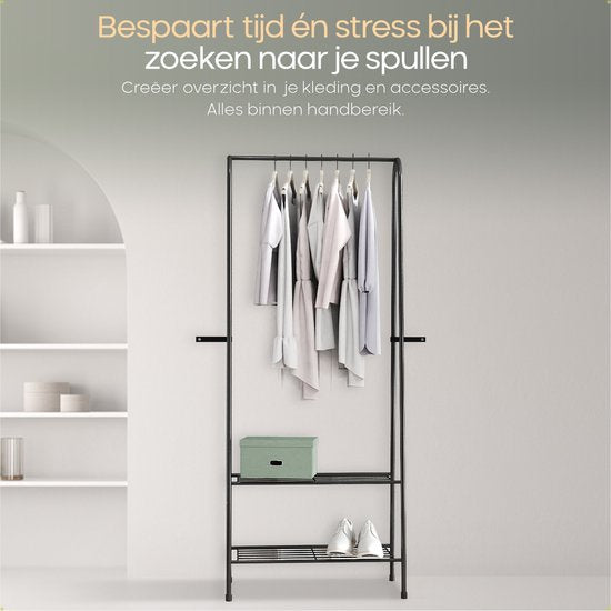 O'DADDY® Kleiderständer stehend - Aufbewahrungsregal 2 Lagen - Schuhregal - Garderobenständer mit Kleiderstange - Kleiderständer - 60 x 36 x 152 cm - Schwarzes Metall