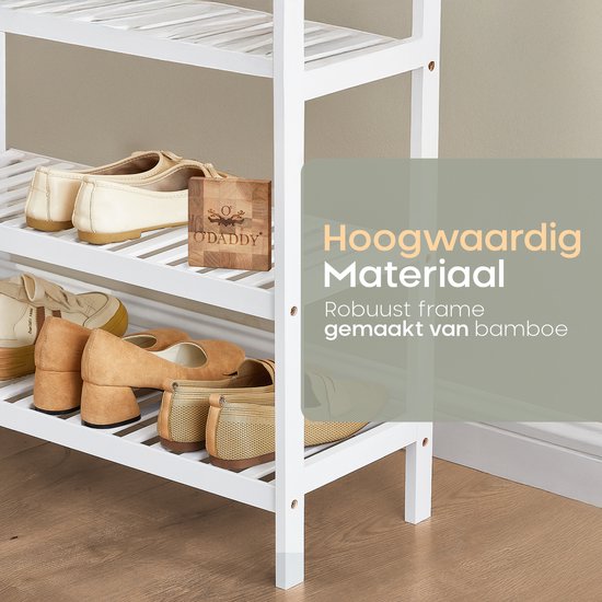Das Regal ist aus hochwertigem Bambus gefertigt, einem Material, das für seine Robustheit und sein natürliches Aussehen bekannt ist. Die Einlegeböden können bis zu 10 kg tragen und sind somit auch für schwerere Schuhe wie Stiefel und Arbeitsschuhe geeignet. Bambus ist pflegeleicht und hält dem täglichen Gebrauch in verschiedenen Räumen Ihres Zuhauses stand.