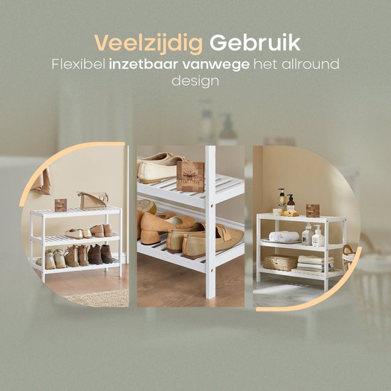 Mit den Maßen 70,1 x 28,7 x 45,3 cm ist dieses Schuhregal kompakt genug für kleinere Räume, bietet aber genug Platz, um mehrere Paar Schuhe geordnet zu lagern. Jede der drei Ebenen ist für Schuhe, Accessoires oder auch kleine Pflanzen geeignet. Es ist nicht nur ideal für den Flur oder das Schlafzimmer, sondern auch perfekt als zusätzlicher Stauraum im Bad, in der Küche oder im Kinderzimmer.