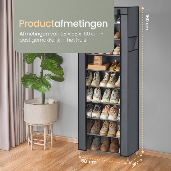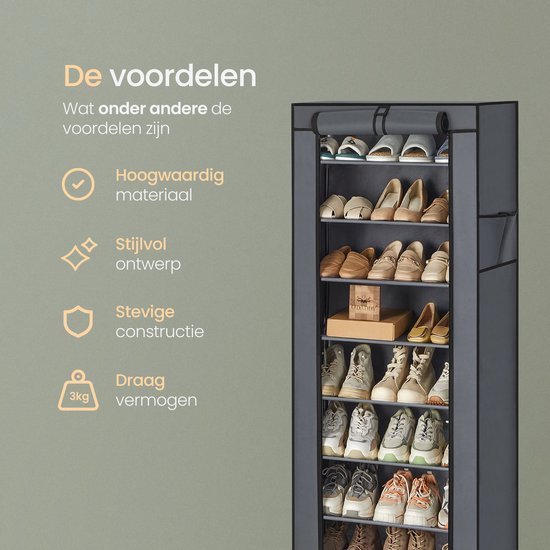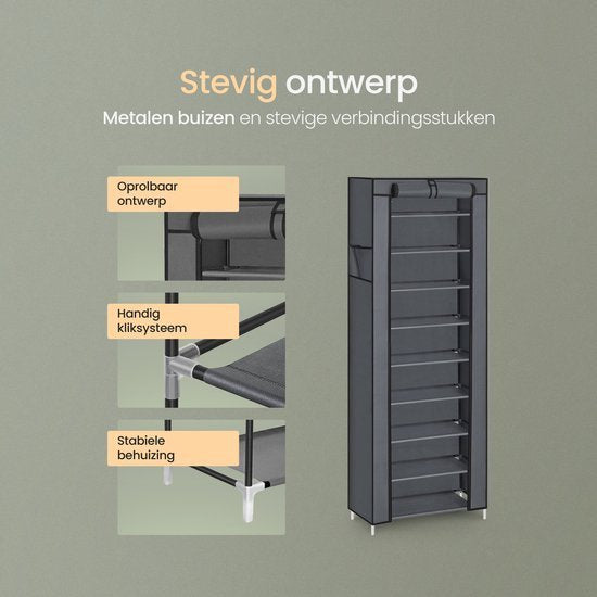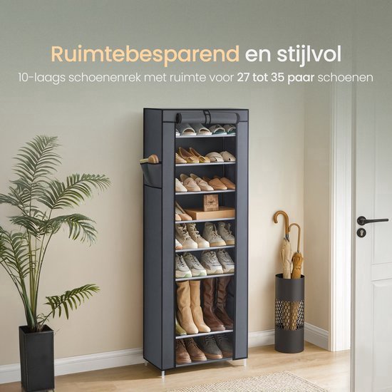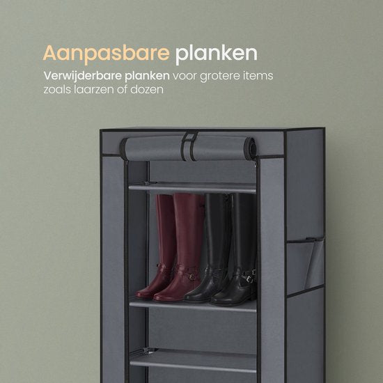 Dieses geräumige Schuhregal ist mit einer staubabweisenden Abdeckung ausgestattet, die Ihre Schuhe vor Staub, Feuchtigkeit und anderen externen Faktoren schützt. Mit dem praktischen Reißverschluss können Sie die Abdeckung einfach schließen, damit Ihre Schuhe schön sauber bleiben. Perfekt für die langfristige Aufbewahrung von Saisonschuhen, ohne dass diese ihr gepflegtes Aussehen verlieren.
