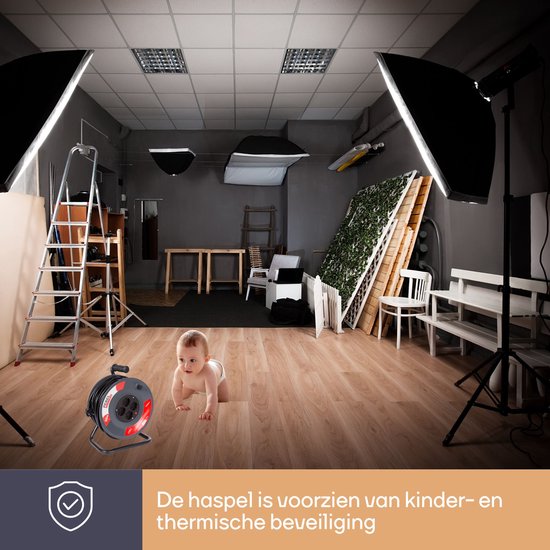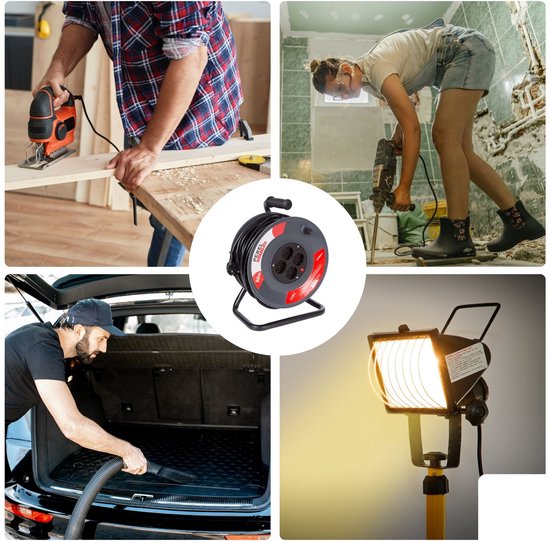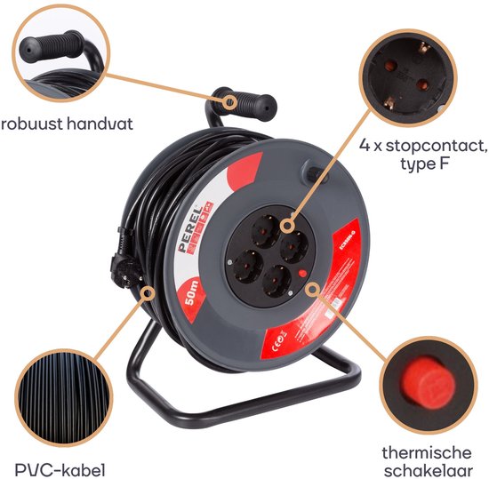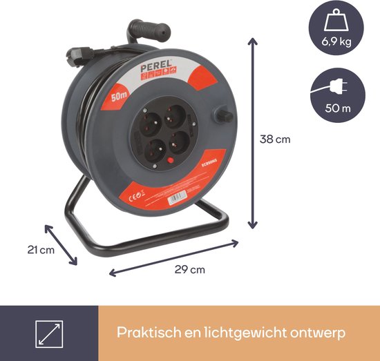 Wenn es an Steckdosen mangelt, ist eine Kabeltrommel bei gelegentlichen Arbeiten unerlässlich. Diese Kabeltrommel von Perel bietet 4 Steckdosen mit Randerdung, Kindersicherung und Thermoschutz, der dafür sorgt, dass das Kabel nicht überhitzt. Die Länge des Kabels beträgt 50 Meter und ist aus flexiblem PVC (H05VV-F).