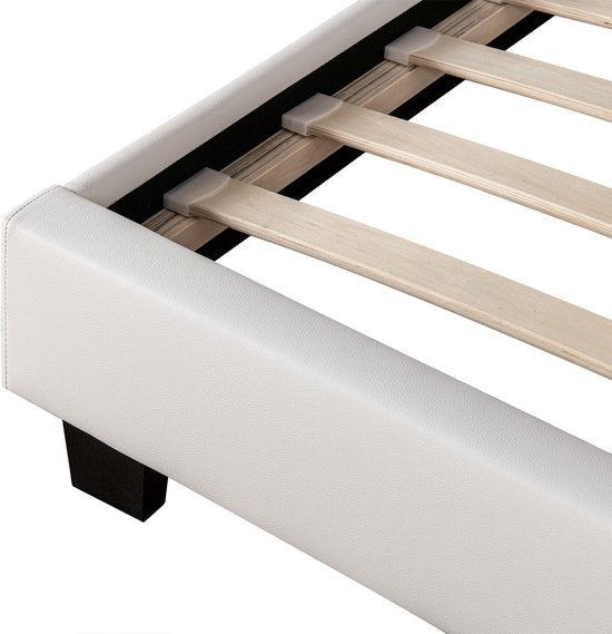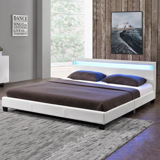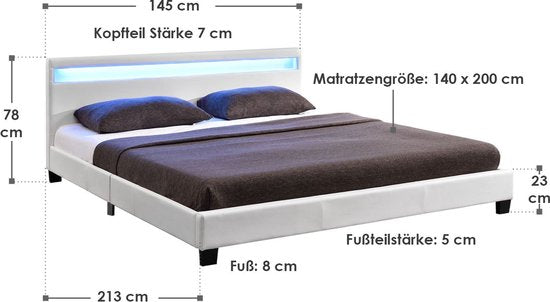 Das Polsterbett in der Größe 140x200 cm, in elegantem Weiß, ist eine echte Überraschung. Dank der Kombination aus Bettrahmen und Lattenrost werden Sie einen äußerst komfortablen und erholsamen Schlaf erleben. Der Lattenrost bietet eine perfekte Unterstützung für Ihre 140x200 cm große Matratze, die sowohl für Jugendliche als auch für Erwachsene geeignet ist. Die kompakte Größe macht das Bett perfekt für kleinere Schlafzimmer oder Gästezimmer. An das fein gepolsterte Kopfteil gelehnt, können Sie entspannt lesen oder fernsehen. Zusätzlich verfügt das Bett über eine integrierte LED-Leiste, die einen schönen Lichteffekt auf dem weißen Kunstleder erzeugt und dem Raum einen atemberaubenden Look verleiht.