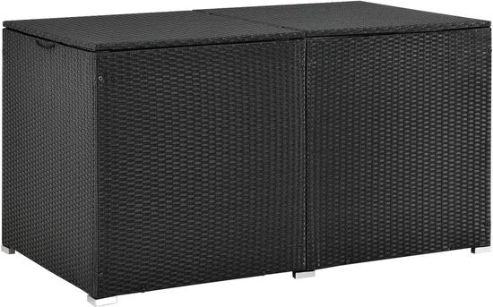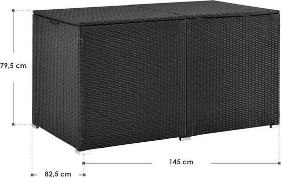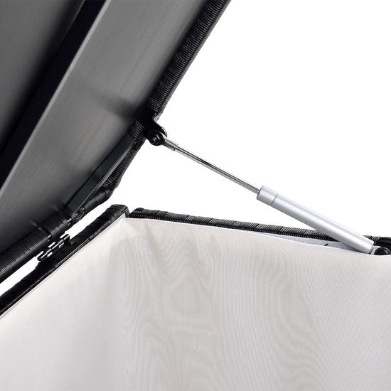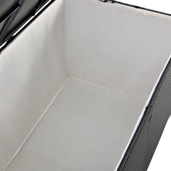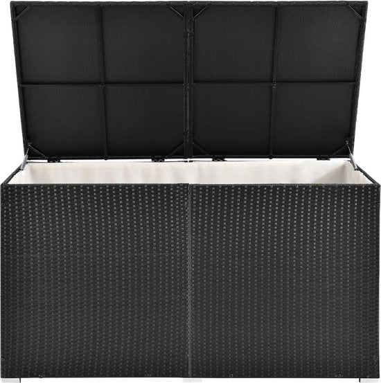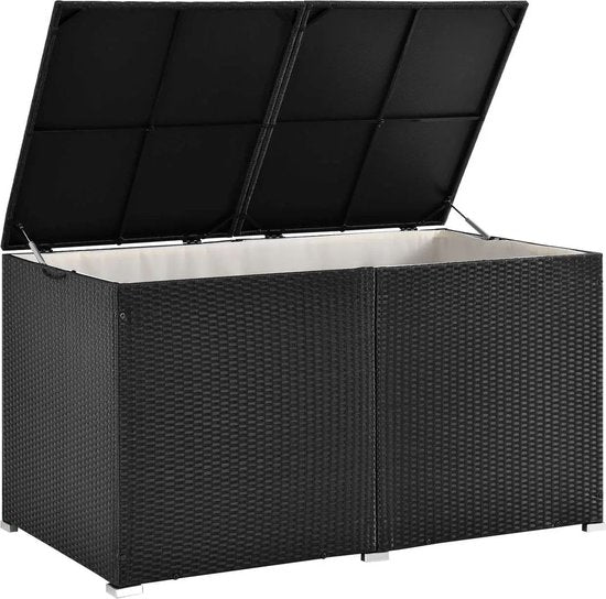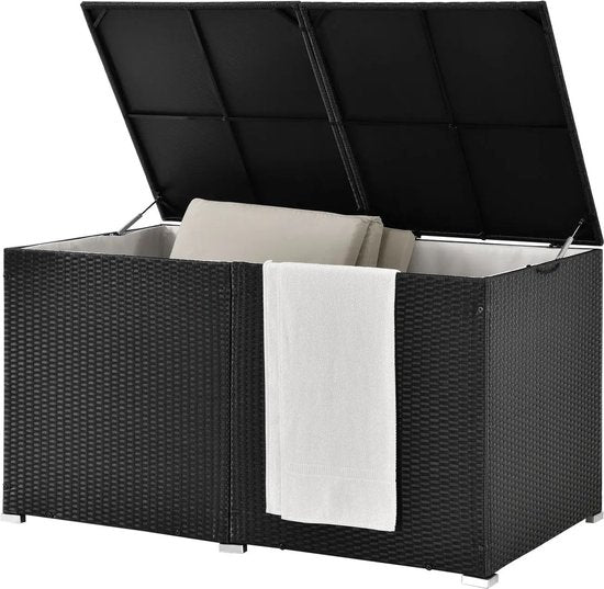 Die Ikaria Polyrattan-Gartenmöbelbox (950 L, schwarz) ist die ideale Lösung zur Aufbewahrung von Gartenzubehör. Kissen, Gartengeräte oder Kinderspielzeug können in dieser Gartenbox ordentlich aufbewahrt werden. Die Innenplane bietet zusätzlichen Schutz, während der Deckel dafür sorgt, dass die Box fest verschlossen bleibt. Ein automatischer Hebemechanismus am Deckel garantiert einen sicheren Verschluss. Diese Aufbewahrungsbox ist eine wunderbare Ergänzung für jede Terrasse, jeden Balkon, jeden Garten oder sogar für den Wintergarten. Die Polyrattan-Box zeichnet sich durch ihr modernes und robustes Design aus. Bitte beachten Sie, dass sie spritzwassergeschützt ist!