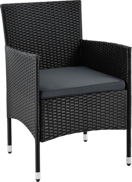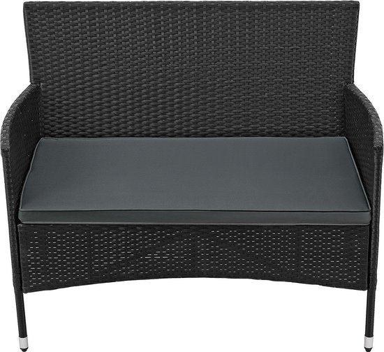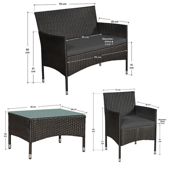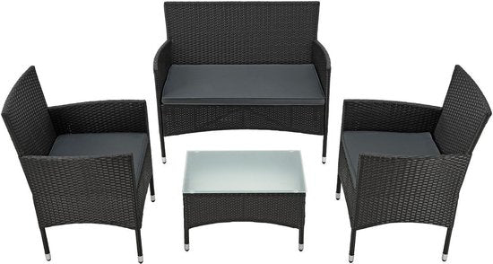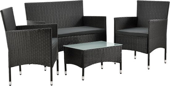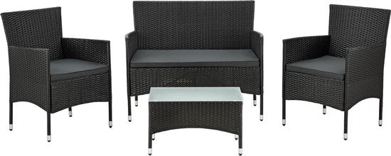Das Fort Myers Poly Rattan Lounge Set (schwarz mit grauen Bezügen) bietet bequemen Sitzkomfort für 4 Personen. Mit ihrem eleganten Rattan-Look verleiht sie jedem Garten, jeder Terrasse oder jedem Balkon Charme. Dank der Rückenlehne und der Kissen eignet sich diese Gartengarnitur hervorragend für gemütliche Stunden mit Freunden und Familie. Das 4-teilige Gartenmöbel-Set mit robustem Metallgestell besteht aus einem Zweisitzer-Sofa, zwei Sesseln und einem kleinen Beistelltisch mit Glasplatte. Dieses Balkonset ist perfekt, um Gäste stilvoll zu empfangen. Stellen Sie Getränke und Snacks auf den Tisch und genießen Sie die Gesellschaft im Sommer.
