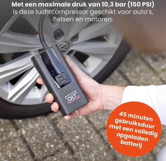 Immer bereit für eine frische Brise! Mit dem kabellosen Luftkompressor von QLT, der auch als Powerbank fungiert, können Sie mühelos Reifen, Bälle und andere Gegenstände aufpumpen. Sie brauchen keine Steckdose. Ideal für Autos, Motorräder, Fahrräder und für den Urlaub. Weg mit den weichen Reifen! Und außerdem ist eine praktische Powerbank eingebaut.