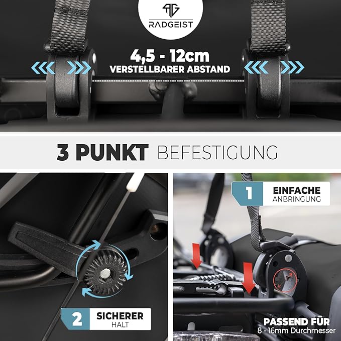 Perfekter Sitz & fester Halt: Geeignet für Gepäckträger mit einem Durchmesser von 8–16 mm. Das verstellbare Befestigungssystem hält die Tasche fest an ihrem Platz, auch auf unebenen Straßen.