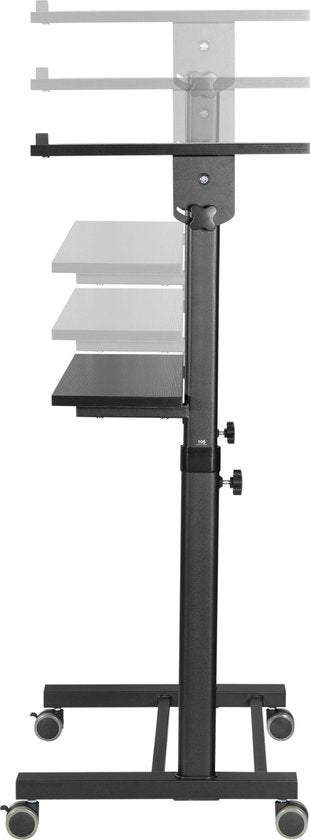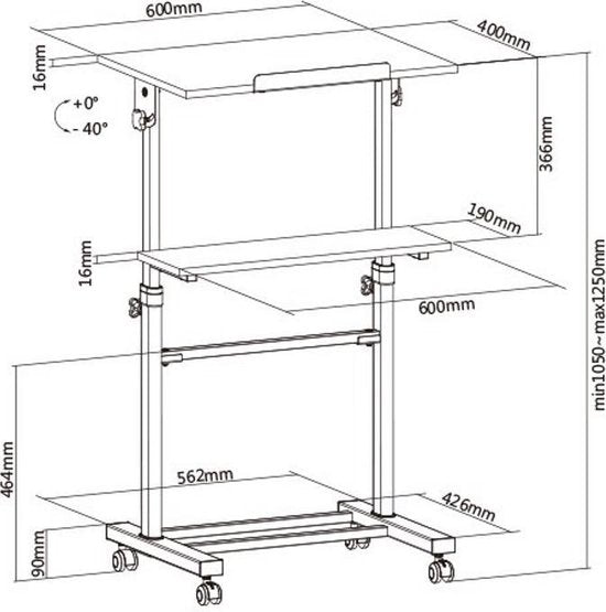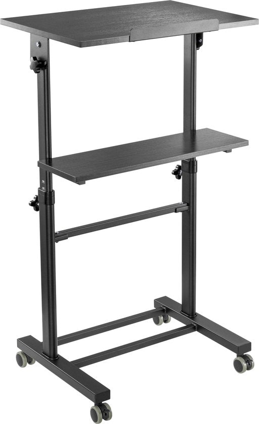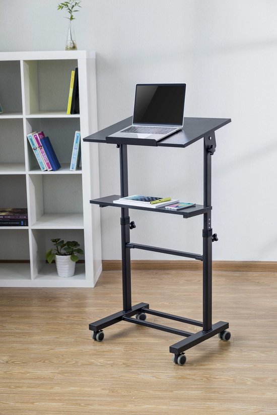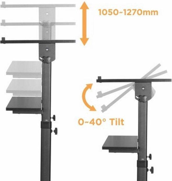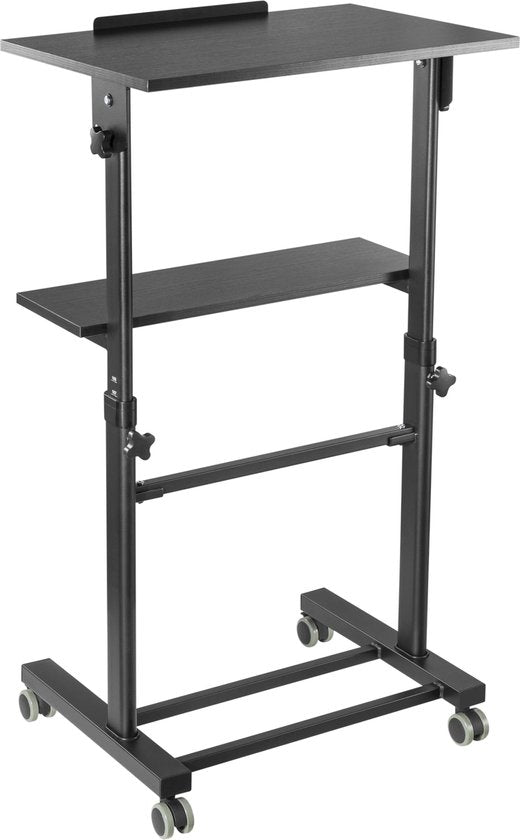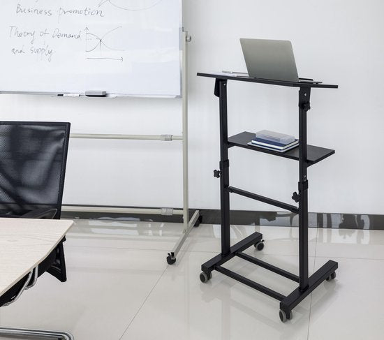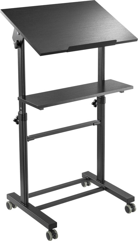 Ein praktischer, stabiler, multifunktionaler, mobiler und höhenverstellbarer Sitz-Steh-Arbeitsplatz, der sich auch hervorragend als Rednerpult-Präsentationsmöbel eignet. Häufig eingesetzt bei Besprechungen, Präsentationen und Videokonferenzen in Konferenzräumen in Schulen, Unternehmen, öffentlichen Ämtern, Empfangsbereichen, in der Gastronomie und auf Messen. Natürlich auch für den Einsatz im Wohn-, Schlaf- oder Studentenzimmer geeignet. Mit einem arretierbaren Drehknopf lässt sich dieses verräterische Präsentationsmöbel schnell in der Höhe von 105 cm bis 125 cm verstellen. Vier feststellbare Rollen sorgen für eine reibungslose und stabile Bewegung von einem Ort zum anderen. Die zusätzliche Ablagefläche bietet mehr Stauraum für Zubehör, Tastatur und Equipment. Belastbar bis zu einem Gewicht von 40 kg. Die Gesamtmaße dieses mobilen Präsentationstisches sind Breite 60 cm x Tiefe 43 cm x Höhe von 105 cm bis 125 cm verstellbar. Für alle separaten Abmessungen siehe Spezifikationsfoto. Die Lieferung erfolgt inklusive Montageanleitung und Einzelteilen.