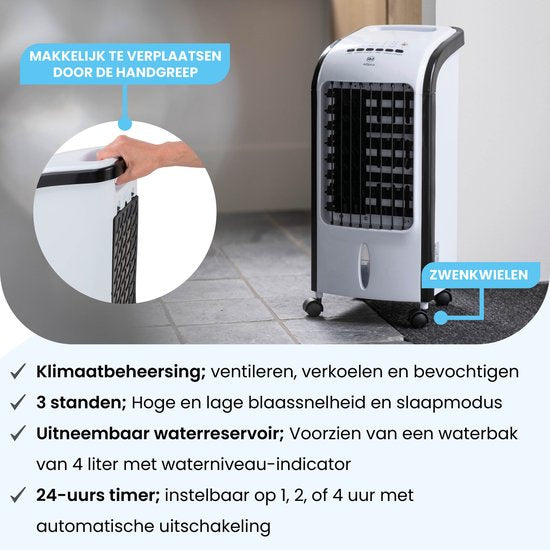 >Mit einem großzügigen 4-Liter-Wassertank und einem leistungsstarken 75-Watt-Motor bietet dieses Klimagerät eine hervorragende Kühlung. Mit einem Geräuschpegel von nur 55 dB ist es zudem sehr leise und damit perfekt für das Schlafzimmer geeignet. Die praktische Timerfunktion ist bis zu 4 Stunden einstellbar, danach schaltet sich das Gerät automatisch ab. Darüber hinaus verfügt das Klimagerät über 3 verschiedene Gebläsegeschwindigkeiten, die über die Tasten auf der Oberseite oder mit der mitgelieferten Fernbedienung einfach gesteuert werden können. Mit den integrierten Rädern lässt sich das Gerät leicht bewegen.