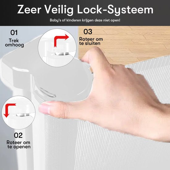 Das Sweet Sprout Treppengitter hat eine Höhe, die verhindert, dass Kinder oder Haustiere darüber klettern können. Das Treppengitter ist außerdem aus robustem Material gefertigt und verfügt über ein Verriegelungssystem. Aktivieren Sie das Sperrsystem, wenn Sie das Treppengitter benutzen. Dadurch wird verhindert, dass sich das Treppengitter versehentlich löst.