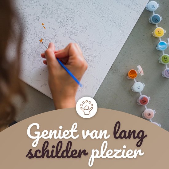 Malen nach Zahlen ist das neue Trendhobby in den Niederlanden und Belgien. Die Leinwand enthält nummerierte Kästchen, die zusammen das Bild ergeben. Mit der mitgelieferten Acrylfarbe und den verschiedenen Pinseln können Sie nun selbst ein schönes Kunstwerk schaffen.