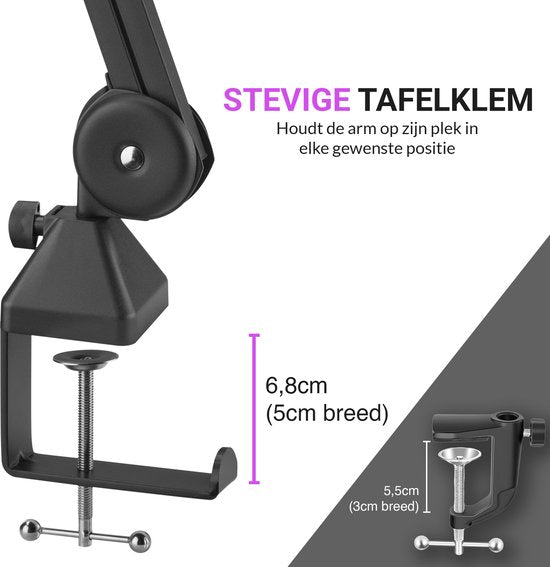 - Der Mikrofonarm ist ziemlich lang (2 Stangen von 50cm), also prüfen Sie vorher, ob er zu Ihrer Einrichtung passt.