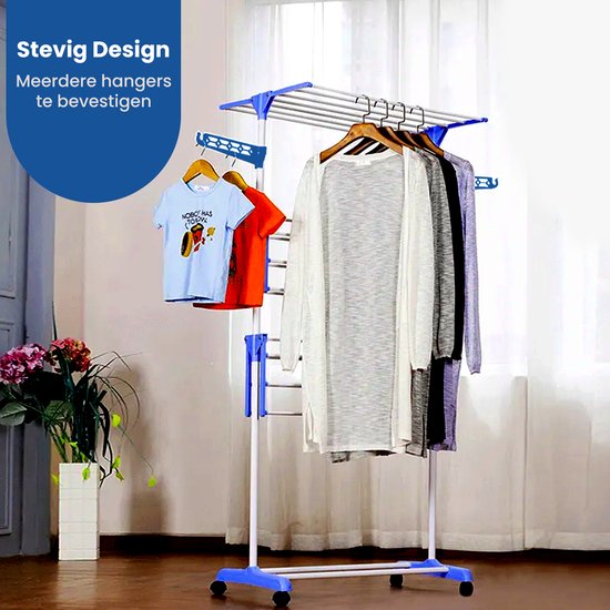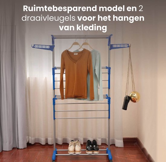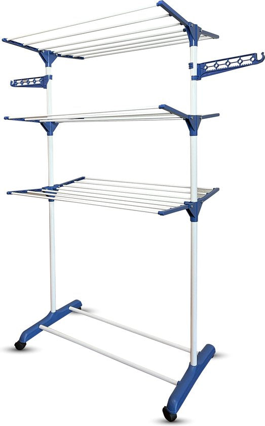 Shine Zusammenklappbarer Wäscheständer mit 3 Etagen und Rädern - Trockenturm - Wäscheständer mit 18 Stangen und 2 Haken - Edelstahl - Verstärktes ABS - 15 Meter Wäscheleine