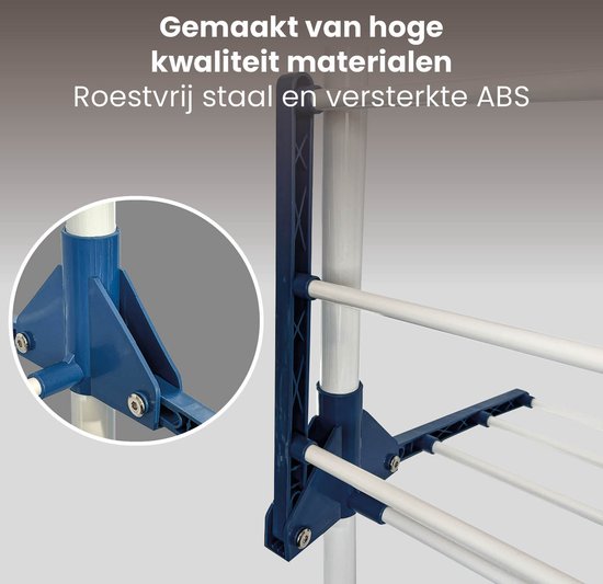 Der Trockenturm ist leicht und dank seiner Räder einfach zu bewegen. Außerdem verfügt der Wäscheständer über Spreizstangen für ein schnelles und gut belüftetes Trocknen. Das stabile ABS-Material sorgt für eine robuste Konstruktion mit 4 feststellbaren Rädern für zusätzliche Stabilität. Dank seines faltbaren Designs kann der Wäscheständer leicht hinter einer Tür oder in einem anderen engen Raum aufbewahrt werden.