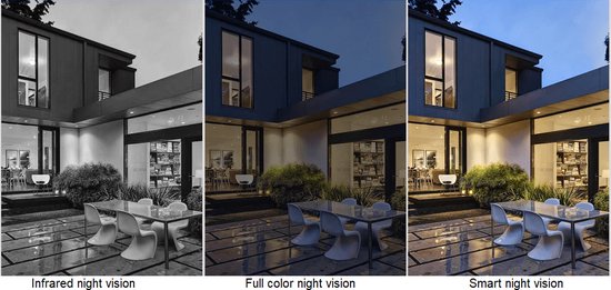 - 3 verschiedene Nachtsichtmodi: Infrarot (schwarz-weiß) / Nachtsicht in Farbe / Intelligente Nachtsicht (helle Farben)