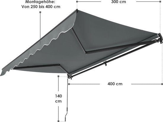 Mit der Gelenkarmmarkise 400 x 300 cm in Grau können Sie ganz einfach einen Sonnenschutz für Ihre Terrasse oder Ihren Balkon schaffen. Diese Markise spendet an sonnigen Tagen hervorragenden Schatten, so dass Sie das Leben im Freien mit Familie und Freunden in vollen Zügen genießen können. Diese Art von Markise ist eine ideale Alternative zu einer Terrassenüberdachung oder einem großen Sonnenschirm, da sie mehr Platz für Ihre Gartenmöbel bietet. Darüber hinaus können Sie die Markise auch vor Ihrem Fenster verwenden, um zusätzlichen Schatten im Raum zu schaffen. Besonders praktisch ist, dass Sie die Länge und den Neigungswinkel des Schirmes selbst einstellen können.