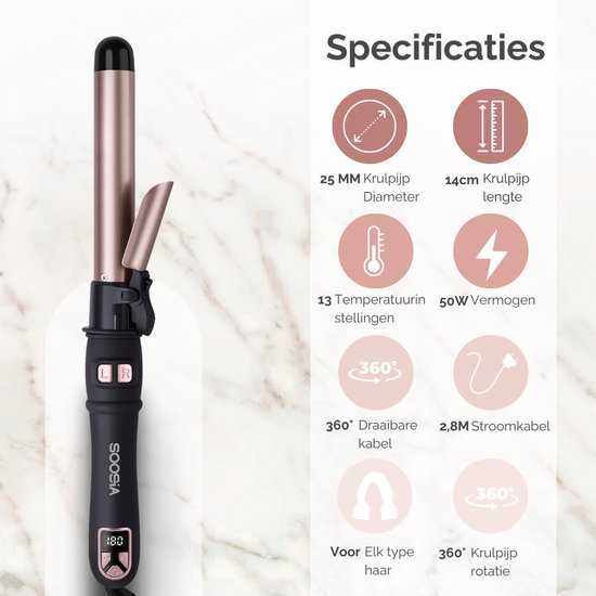 Der automatische Lockenstab von Soosia ist für ein einfaches Styling konzipiert. Dank des 25-mm-Laufs kreieren Sie wunderschöne, elastische Locken, die den ganzen Tag lang perfekt an ihrem Platz bleiben. Dank der automatischen Lockenfunktion brauchen Sie nur eine Haarsträhne in die Zange zu legen, den Knopf zu drücken und schon haben Sie in Sekundenschnelle eine perfekte Locke. Kein mühsames Verdrehen von Hand, keine Unebenheiten. Moderate Locken - für einen mühelosen Look!