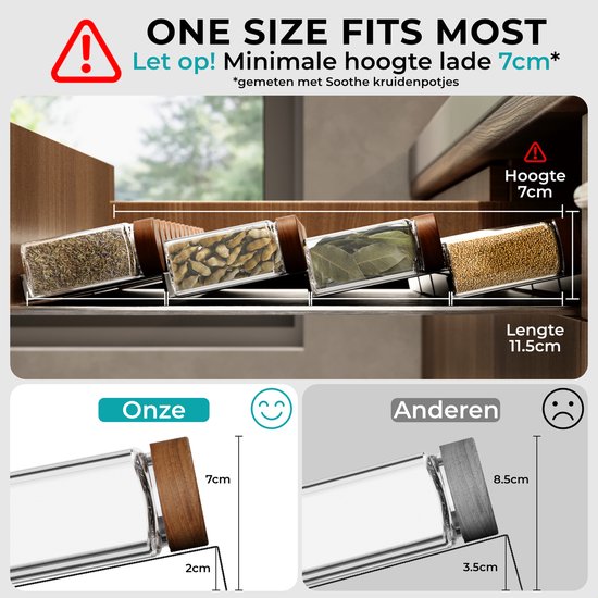 Die Maße dieses verstellbaren Gewürzregals wurden sorgfältig abgestimmt, damit es nahtlos in Ihre Küchenschublade passt. Bitte beachten! Messen Sie Ihre Küchenschublade vor dem Kauf aus. Stellen Sie sicher, dass sie eine Mindestbreite von 23 cm und eine Mindesthöhe von 7 cm hat. Denken Sie an eine Mindesthöhe von 8 cm, wenn Sie Euroma Gewürzdosen verwenden.