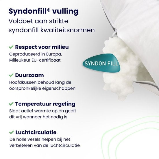 Unsere Kissen verfügen über eine luftige Syndonfill® Füllung; die Füllung für ultimativen Schlafkomfort. Die Polyester-Hohlfasern fühlen sich an wie weiche Daunen, sind aber komplett aus strapazierfähigem Synthetikmaterial hergestellt.