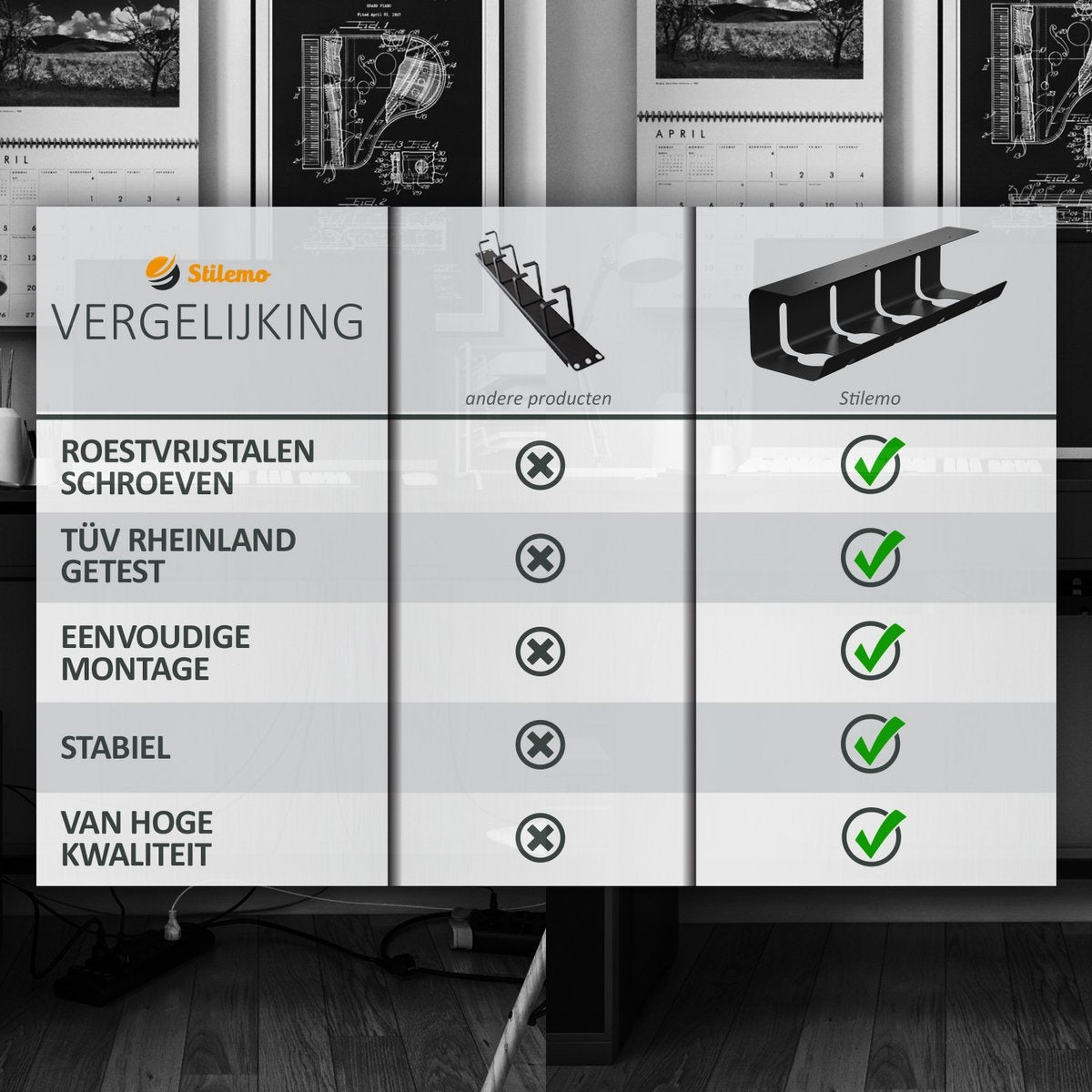 Mit dem modernen Stilemo-Kabelhalter schaffen Sie mehr Ruhe und Ordnung an Ihrem Arbeitsplatz und sorgen für ein angenehmes und sicheres Arbeitsumfeld. Der Kabelhalter macht es Ihnen leicht, Kabel zu verstauen und spart Platz. Kein Chaos mehr auf oder unter dem Schreibtisch, sondern ein aufgeräumter Arbeitsplatz ohne allerlei lose Kabel.