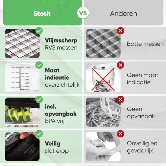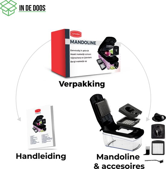 Lieben Sie auch gutes Essen? Aber hassen es, jedes Mal von Hand zu schneiden? Dann entdecken Sie die Mandoline von Stosh. Mit ihr schneiden Sie Gemüse, Obst oder Kartoffeln bis zu 3x schneller. Schneiden. Raspeln. Spiralisieren. Mit den austauschbaren Einsätzen verwandeln Sie Ihre Mandoline im Handumdrehen von einem Spiralschneider in einen Hobel oder eine Reibe. So bringen Sie im Handumdrehen die leckersten Gerichte auf den Tisch. Durchsichtig. Nimmt wenig Platz weg und ist leicht zu verstauen. BPA-frei. Lässt sich schnell abspülen und reinigen. Bereit für das nächste Gericht. Was werden Sie heute Abend essen? 1. einfach zu benutzen Öffnen. Einlegen. Schneiden. Im Handumdrehen haben Sie frisch geschnittene Zwiebelringe, Gurken oder geriebenen Käse auf dem Tisch. Wechseln. Mit den 6 mitgelieferten Einsätzen schneiden Sie all Ihre Lebensmittel dick, dünn oder spiralförmig. Rutschfest. Die Gummifüße auf der Unterseite verhindern ein leichtes Abrutschen. So bleibt Ihre Mandoline immer sicher an ihrem Platz. 2. Leicht zu reinigen Essen macht Spaß. Reinigen weniger. Geben Sie Ihre Mandoline nach dem Gebrauch einfach in die Spülmaschine. Oder waschen Sie sie direkt von Hand und mit der mitgelieferten Bürste. So wird Ihre Mandoline im Handumdrehen wieder makellos BPA-frei. Einmal gereinigt, lässt sie sich leicht zusammen lagern. 3. rasiermesserscharf und extrem stark Hergestellt aus rasiermesserscharfem Edelstahl und extrem starkem Kunststoff. Das bedeutet, dass Ihre Mandoline ein Leben lang halten wird. Schneiden Sie auch das härteste Obst oder Gemüse mit Leichtigkeit. Geeignet für Kartoffeln, Zwiebeln, Zucchini, Tomaten, Karotten und mehr. 4. 3x schneller als von Hand Mit dem cleveren Design und der einfachen Handhabung können Sie Obst oder Gemüse bis zu 3x schneller schneiden als von Hand. Ideal zum schnellen Schneiden von Tomaten, Zwiebeln oder Zucchini. So haben Sie im Handumdrehen die leckersten Suppen, Salate oder Salsas vor sich. 5. einfach aufzubewahren Begrenzter Platz oder eine kleine Küchenzeile? Dann verstauen Sie Ihre Mandoline nach Gebrauch schnell und einfach, indem Sie sie zusammenschieben. Inklusive Anleitung, Bürste und Halter. Hinweis: Lesen Sie die Anleitung vor dem Gebrauch immer sorgfältig durch und bewahren Sie die Mandoline stets außerhalb der Reichweite von Babys, Kleinkindern oder Kindern auf. Vorteile: Einfach zu bedienen Schnell zu reinigen Hält ein Leben lang Platzsparend BPA-frei Inhalt Verpackung ➜ 1 x Mandoline ➜ 4 x Einsätze ➜ 1 x Reinigungsbürste ➜ 1 x Anleitung Spezifikationen: Marke: Stosh Farbe: Schwarz/Weiß Material: Polypropylen (PP 5) - Edelstahl Abmessungen: 20cm x 11,5cm x 7,5cm (LxBxH) Geeignet für: Kartoffeln, Karotten, Zwiebeln, Zucchini, Tomaten, Gewicht: 700 Gramm