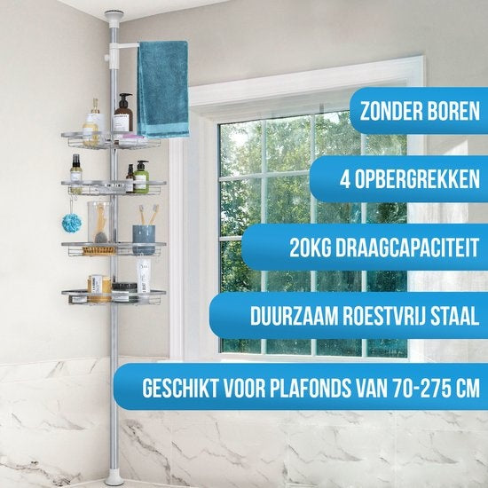 Strex - Teleskop Duschablage - rostfreier Stahl - 70-275 cm - 4 Körbe - ohne Bohren oder Schrauben - Silber