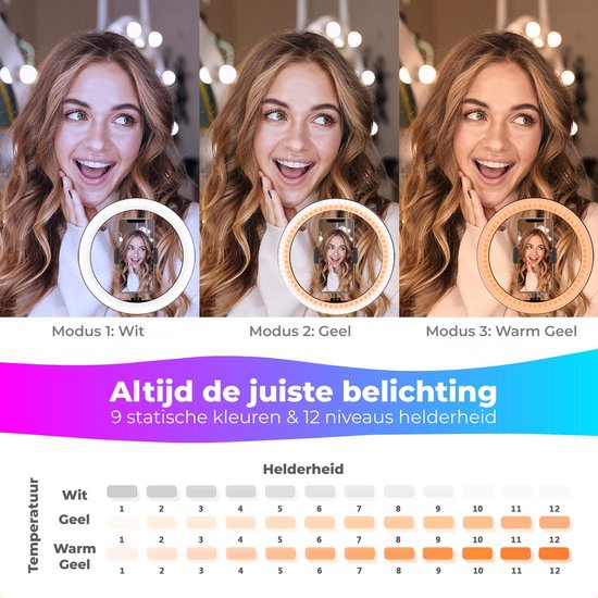 Mit der Studio ME - Multicolour Ring Lamp mit Stativ kannst du deine eigenen Fotos oder Videos erstellen, die unter all den anderen Inhalten in den sozialen Medien herausstechen und glänzen. Da du die Helligkeit selbst einstellen kannst, belichtest du jedes Detail auf ganz natürliche Art und Weise. Selbst in dunklen Umgebungen lässt du jedes Detail auf dem Foto hervorspringen, so dass dein ganzes Gesicht und andere Elemente perfekt beleuchtet sind. Du oder speziell das schöne Funkeln in deinen Augen. Außerdem hast du neben der Helligkeit auch die volle Kontrolle über die Wärme des Lichts, um das ideale Ambiente zu schaffen.