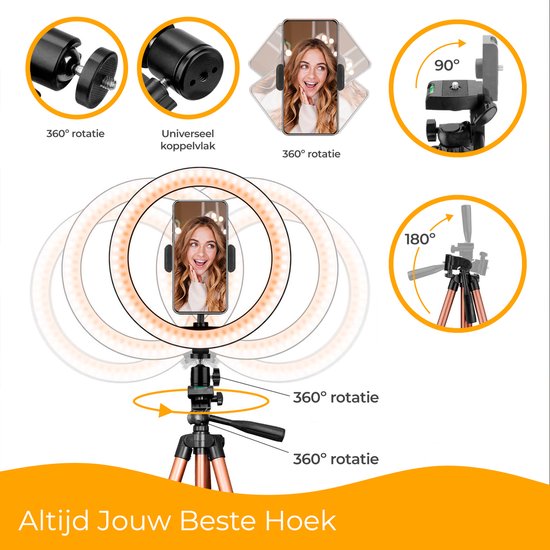 Ob Sie es für ein persönliches Make-up-Tutorial, einen Livestream, Vlog oder einfach nur für ein schönes Selfie verwenden, das Ringlicht bietet immer die richtige Position und Drehung für Sie. Das Ringlicht für das Handy kann auch auf die ideale Höhe eingestellt werden. Ob Sie die TikTok-Lampe zu Hause auf dem Küchentisch (mindestens 40 cm) oder draußen auf der Straße (maximal 127 cm) platzieren: Sie können überall das perfekte Licht erzeugen, um Ihr Foto oder Video genau in Szene zu setzen. Jetzt auch mit extra kleinem Stativ für auf dem Tisch!