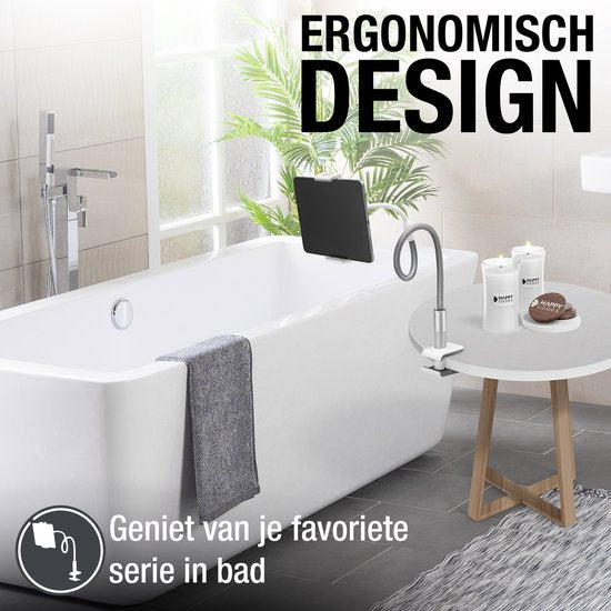 Der weiße Tablet-Halter wird zweifellos Ihr neuer unverzichtbarer Helfer zu Hause werden. Ideal für Videotelefonie, Videoaufnahmen und um die Hände beim Kochen oder Sport frei zu haben, und vieles mehr. Das Besondere an diesem Tablet-Halter ist, dass Sie ihn nach Belieben biegen können und er fest an seinem Platz bleibt.