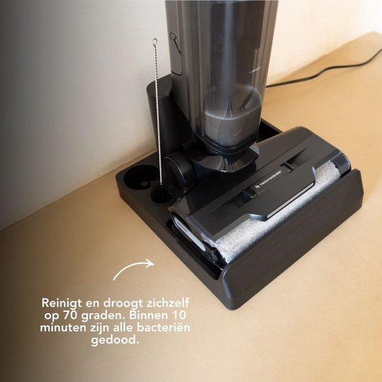 Saugen, wischen und dann warten, bis der Boden trocken ist? Von nun an machen Sie alles in één Bewegung. Dieser Mopstaubsauger saugt álle, wischt und trocknet sie sofort. Und das alles in einer einzigen Bewegung.