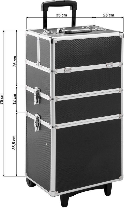 Nie wieder ohne unterwegs: Ob Make-up, Nähzeug oder andere Reiseutensilien - der praktische und formschöne Kosmetiktrolley von TecTake bietet ausreichend Platz und optimalen Schutz für all Ihre Schätze. Der Koffer besteht aus 3 samtüberzogenen Ebenen, die beliebig miteinander kombiniert werden können. Der obere Teil kann einzeln als Handgepäck genutzt werden. Alle Ebenen sind separat abschließbar. Der ausziehbare Griff des Kombikoffers lässt sich perfekt auf die verschiedenen Höhen einstellen. Die leichtgängigen Skaterrollen und die metallverstärkten Ecken verleihen dem Beautycase maximale Mobilität und Sicherheit. Praktisch, leicht und schick: Der Kosmetiktrolley von TecTake ist ein treuer Begleiter bei allen Anwendungen.