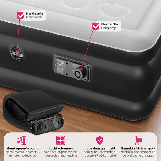 - Komfortable Luftmatratze mit eingebauter elektrischer Pumpe für müheloses Aufblasen und Ablassen