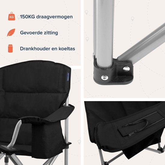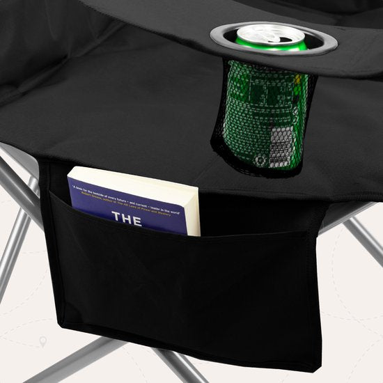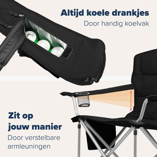 TRVLMORE Campingstuhl - Zusammenklappbar - Komfortabler Klappstuhl - 150 kg Belastbarkeit - Getränkehalter - Kühlfach - Seitentasche - Schwarz