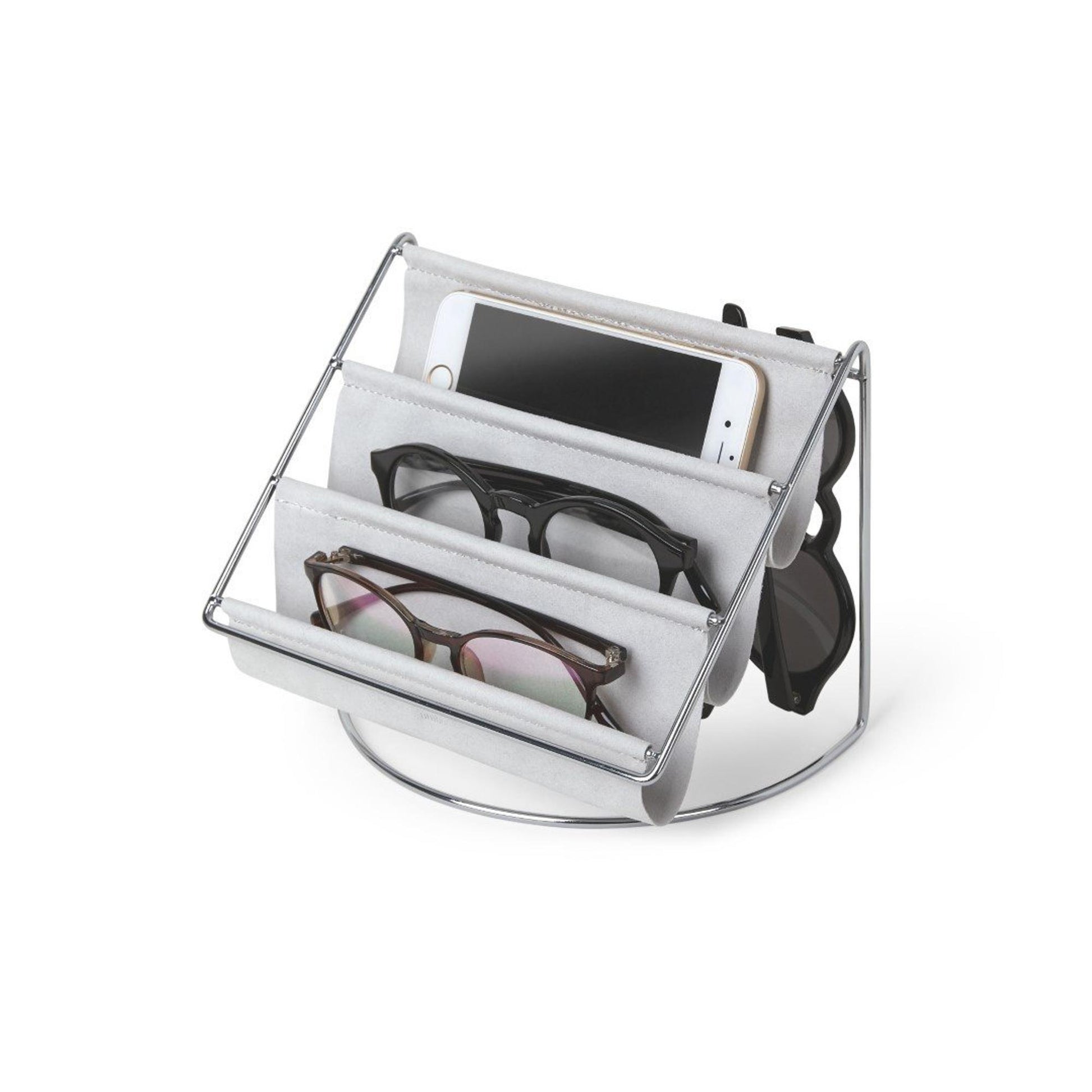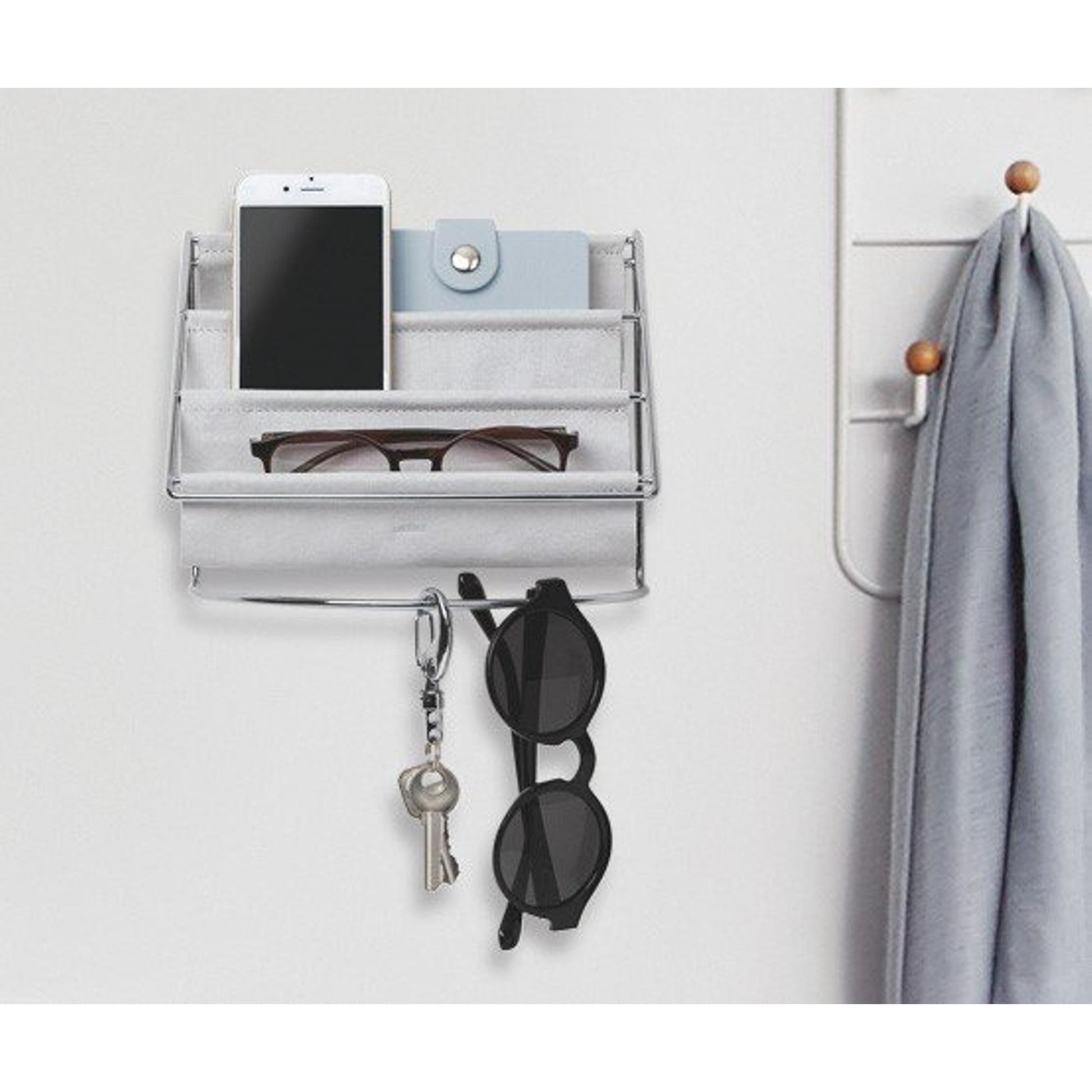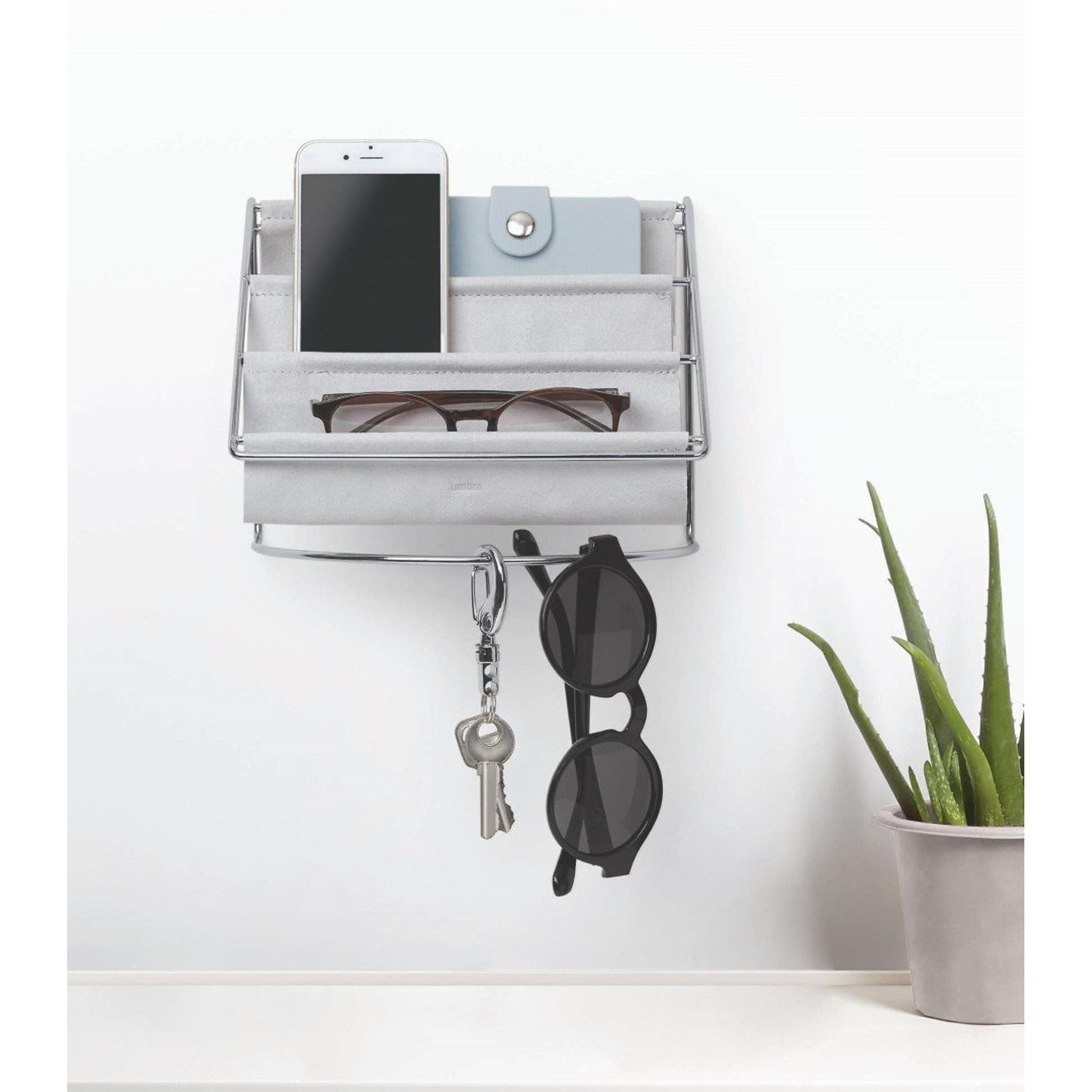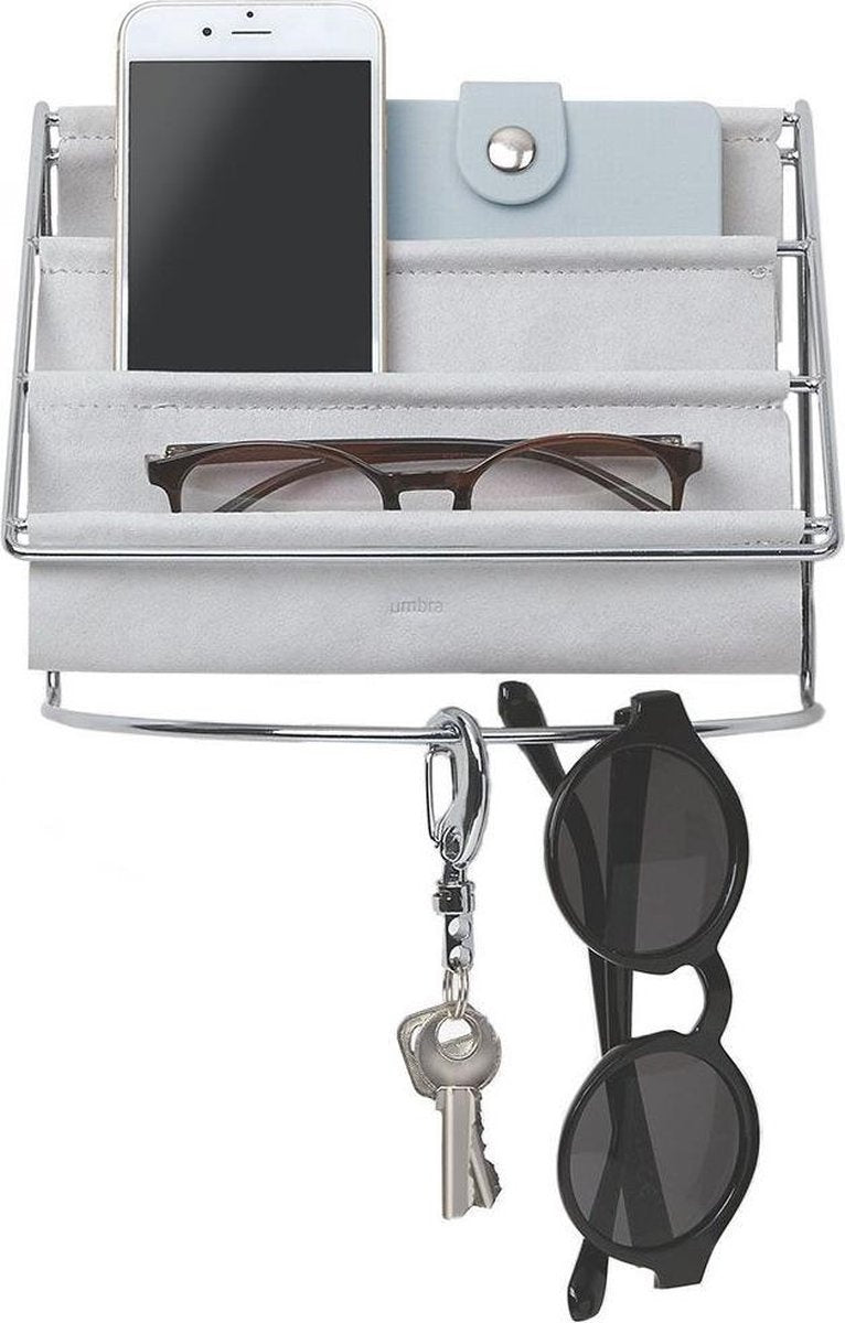 Mit der HAMMOCK können Sie Ihre wichtigen Dinge stilvoll aufbewahren. Dieser Organizer ist aus grauem Wildleder und verchromtem Metalldraht gefertigt, behandelt Ihre Accessoires mit Sorgfalt und ist schön anzusehen.