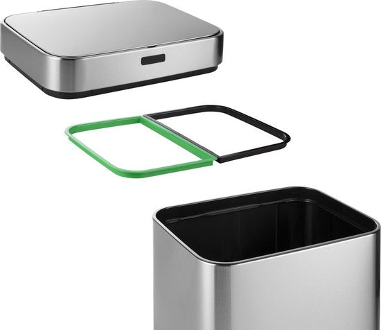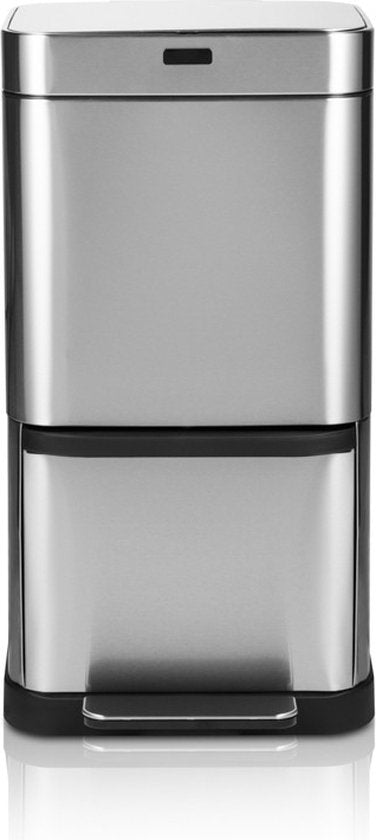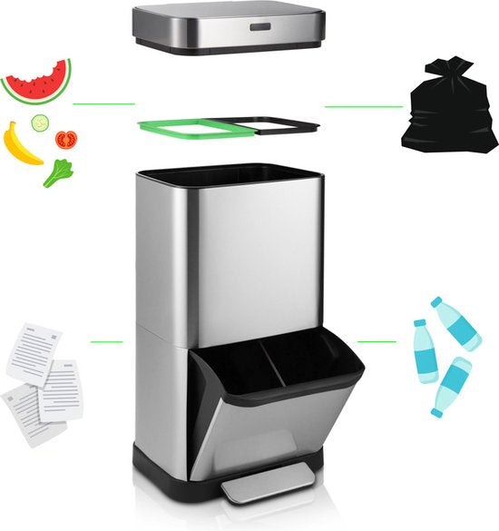 Außerdem ist dies eine intelligente Wahl, die zur Benutzerfreundlichkeit im Haushalt beiträgt. Unten befinden sich 2 getrennte Fächer, die mit Hilfe der beweglichen Trennwand nach Belieben angeordnet werden können. Oben befindet sich ein großer Behälter, der in 2 Bereiche unterteilt ist. So können Sie Plastik, Papier, Bioabfall und Restmüll leicht trennen. Außerdem muss man beim Abräumen des Tisches nicht mehr eine Hand frei haben, um den Deckel zu öffnen, bevor man den Abfall entsorgt.