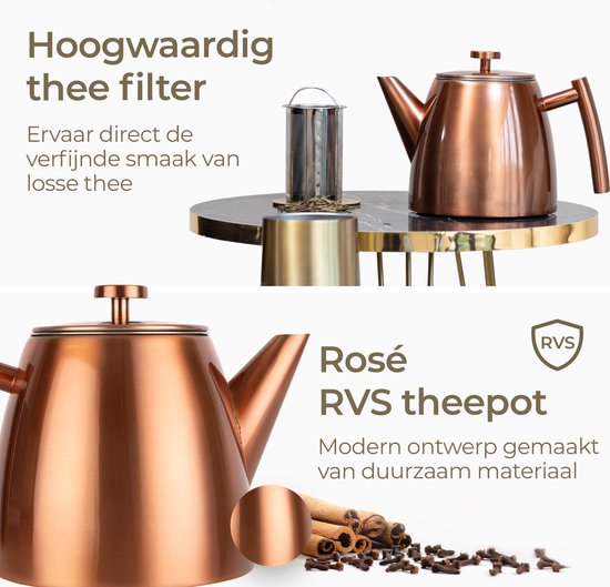 Vaja® Teekanne Juliette Rosé - Doppelwandig - 1 Liter - Edelstahl-Teekanne mit Filter & Heißhalterung