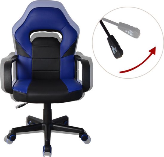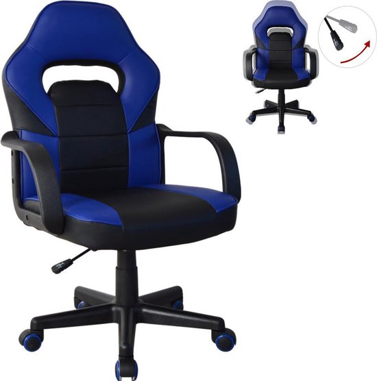 Ein formschöner, funktioneller, blau-schwarzer Bürostuhl mit bequemer Kunstlederpolsterung im Gaming-Racing-Stil für einen angenehmen Sitzkomfort am Schreibtisch oder Tisch beim Spielen, aber auch beim Arbeiten, Lernen oder anderen Tätigkeiten. Der Sitzkomfort wird durch den robusten, pflegeleichten PU-Lederbezug der Polsterung, die geformte Kopfstütze, den stabilen Sitz, die 64 cm hohe Rückenlehne und die 47 cm breite und 45 cm tiefe Sitzfläche gewährleistet. Erweitert wird der Racing Gaming Bürostuhl junior durch eine höhenverstellbare Sitzfläche von 102 cm bis 112 cm = Sitzhöhe von 43 cm bis 53 cm und eine ergonomische Armlehne. Dieser Bürostuhl im Gaming-Look ist um 360 Grad drehbar und steht stabil auf einem stabilen Kunststoffgestell mit fünf Rollen. Ob harter oder weicher Untergrund, dieser Stuhl fährt immer leicht über den Untergrund. Farbe: schwarz blau. Stuhlmaße: hoch: 102 - 112 cm breit 57 cm und tief 45 cm. Sitzhöhe: 43 - 53 cm. Sitztiefe: 45 cm. Sitzbreite 47 cm. Rückenlehne Höhe 64 cm. Maximale Belastbarkeit: 90 kg. Lieferung inklusive Montageanleitung und benötigtem Montagematerial.