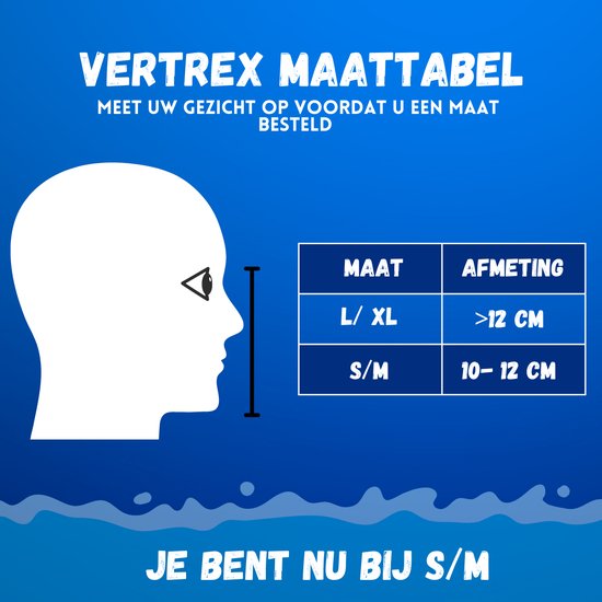 Diese Schnorchelmaske ist in zwei Größen erhältlich. Dies ist das Modell S/M. Messen Sie den Abstand von der Nasenspitze (auf Augenhöhe) bis zum Kinn. Wenn der Abstand weniger als 12 Zentimeter beträgt, wählen Sie S/M. Wenn der Abstand größer ist, wählen Sie L/XL.