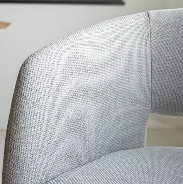 Der Esszimmerstuhl Boden verbindet ein zeitloses Design mit hohem Sitzkomfort. Der weiche, hellgraue Stoffbezug fühlt sich angenehm an, während der schalenförmige Sitz für eine natürliche, stützende Haltung sorgt. Das robuste schwarze Metallgestell verleiht dem Stuhl einen modernen Look und macht ihn alltagstauglich.