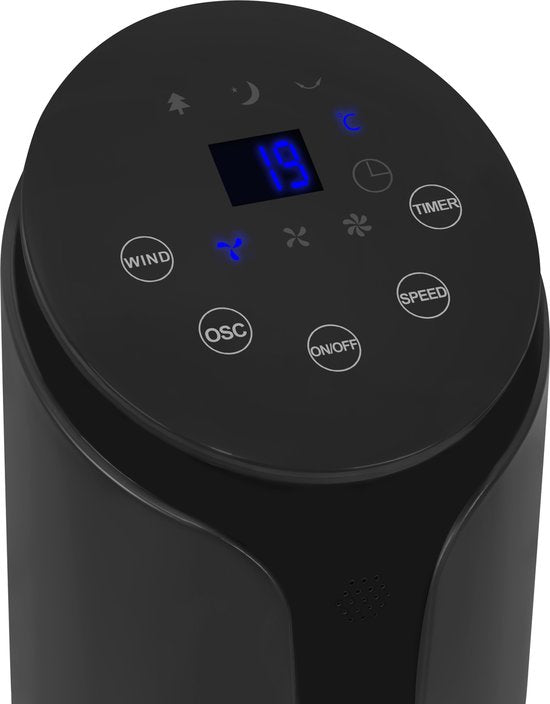 Dieser stilvolle Turmventilator wird eine schicke und moderne Ergänzung für Ihr Interieur sein. Das schöne, moderne Bedienfeld verfügt über ein LED-Display und luxuriöse Touch-Tasten. Sie können zwischen 3 verschiedenen Geschwindigkeiten (niedrig, mittel, hoch) wählen, und ein 15-Stunden-Timer ist verfügbar. Mit der Oszillationsfunktion wird der Raum gleichmäßig mit frischer Luft angereichert. Der Ventilator wird mit einer Fernbedienung geliefert, so dass Sie ihn von überall aus bedienen können.