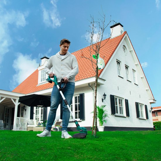 Pflegen Sie Ihren Rasen mit dem VONROC Rasentrimmer 20V Pflegen Sie Ihren Rasen an Stellen, die der Rasenmäher nicht erreicht? Dann nutzen Sie den VONROC Rasentrimmer 20V. Der große Vorteil eines akkubetriebenen Rasentrimmers ist, dass Sie sich nicht mehr mit Verlängerungskabeln herumschlagen müssen, sondern einfach sicherstellen, dass der Akku aufgeladen ist und Sie loslegen können. Dieser Rasentrimmer hat einen großen Schnittdurchmesser von 250 mm und verfügt über eine Doppelspule von nicht weniger als 8 Metern (2x4m). Wofür ist dieser Akku-Rasentrimmer geeignet? Trimmen von Rasenkanten Trimmen/Schneiden/Beschneiden von Unkraut Mähen von Kanten Mähen von Grünstreifen Ordentlicher Abschluss von schwer zugänglichen Ecken und Kanten, die Sie mit einem Rasenmäher nicht erreichen können Es handelt sich um ein leichtes Gerät, aber Sie können es außer zum Trimmen von Rasenkanten auch zum Trimmen von mittelhohem Unkraut, zähem Gras und anderem Bewuchs verwenden Hauptvorteile des kabellosen Rasenkantenschneiders Doppelte Drahtspule mit einer Länge von nicht weniger als 8 Metern (2x4m). Mit ‘tap and go’ System zum Verschieben der Drahtspule, ‘schneidet’ der Kantenschneider die Schnur selbst auf die richtige Länge. Großer Schneide-/Trimmdurchmesser von 250 mm. Teleskopische Aluminiumstange, einstellbare Höhe 420 – 700mm. Für eine ergonomische Arbeitsposition. Sichere Ein-/Ausschalttaste mit zusätzlichem Sicherheitsschalter, der ein versehentliches Einschalten verhindert. Doppeltes Abstandsrad, um Ihre Rasenkante schön/gerade und einfach zu trimmen. Der Trimmkopf kann gedreht und geneigt werden. Großer Sicherheitsschutz, der verhindert, dass Sie beim Trimmen von Steinen oder anderem Material getroffen werden. Der zweite Griff ist verstellbar, um eine ergonomische/bequeme Arbeitsposition zu gewährleisten. Sie brauchen eine neue Schnurspule? Dann bestellen Sie die Schnurspule 2 Stück (GT801AA) für den Rasentrimmer GT501DC. Für den Austausch der Fadenspule ist kein Werkzeug erforderlich. Anwendungstipps Beim Passieren von hartem Material (z.B. Steine und Zaunpfähle) empfehlen wir, den Rasentrimmer nicht ständig laufen zu lassen, sondern ihn jedes Mal kurz ein- und auszuschalten (oder: zu pulsieren). Auf diese Weise wird die Geschwindigkeit reduziert, so dass das Kabel nicht so schnell verschleißen oder brechen kann. Außerdem bleibt die Trimmleistung so gut wie immer! VONROC VPower 20V Plattform – Welchen Akkutyp wählen Sie für Ihren Rasentrimmer? Dieser Akku-Grasschneider wird ohne Akku und Ladegerät geliefert, da er Teil der VONROC VPower 20V Platform ist. Optional können Sie die austauschbaren 2.0Ah oder 4.0Ah Akkus bestellen’s. Wenn Sie den Kantenschneider mit anderen Maschinen der VONROC VPower 20V Plattform kombinieren wollen, reicht ein 20V-Akku mit Schnellladegerät aus! Wählen Sie nur das, was Sie brauchen, und das zu einem wettbewerbsfähigen Preis! Was befindet sich in der umweltbewussten Verpackung? 1x Accu Grastrimmer 20V – GT501DC 1x Spule 8m (2x4m) 1x Doppelführungsrad 1x Handgriff Technische Daten: Spannung: 20V Batteriekapazität: 2.0Ah oder 4.0Ah (ACHTUNG:VPower Akku und Ladegerät nicht im Lieferumfang enthalten) Leerlaufdrehzahl: 8000/min Schneiddurchmesser: 250mm Teleskopstange: 420 – 700mm Einstellbarer Winkel der Stange: 0° - 90° Einstellbarer Winkel des Trimmkopfes: 0° - 90° Trimmsystem: 2-Linien-Drahtspule, Tap and Go Ø1.2mm x 8m Gewicht (ohne Akku): 2.1kg